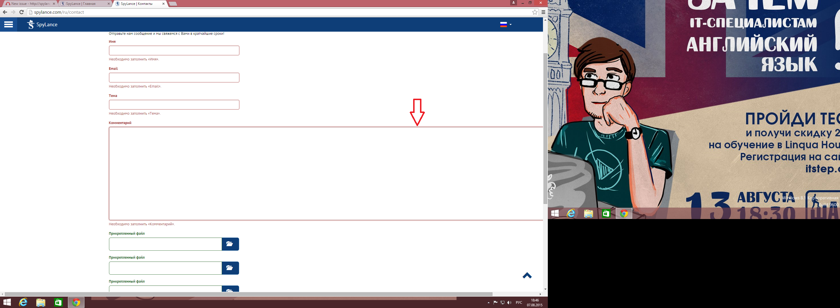 В разделе "Контакты" поле "Коментарий" выходит за пределы странички