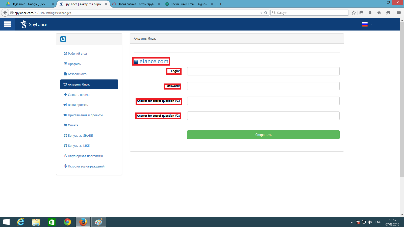 В поле "Аккаунты бирж " поля для заполнения на английском языке