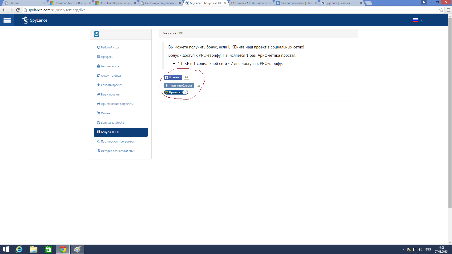 4.Открыть страницу "Бонусы за лайки" http://spylance.com/ru/user/settings/like