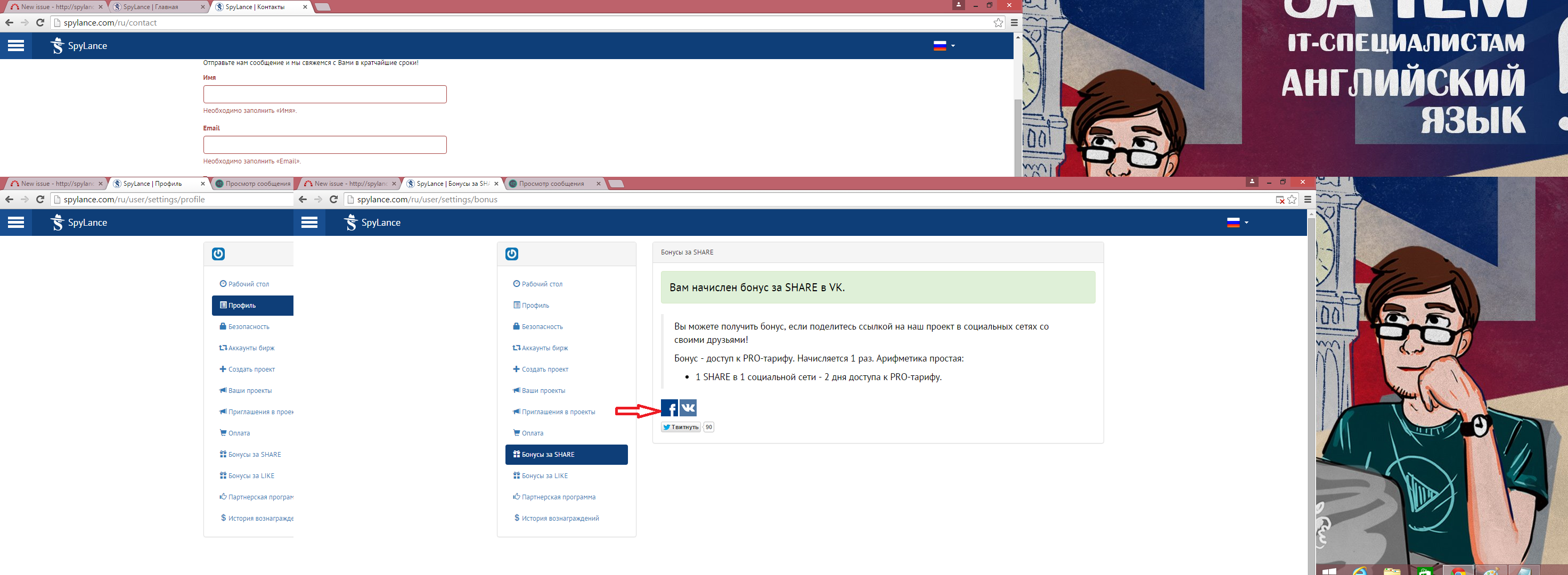 В разделе "Аккаунт" подраздел "Бонусы за Share" не работает ссылка на "Facebook"