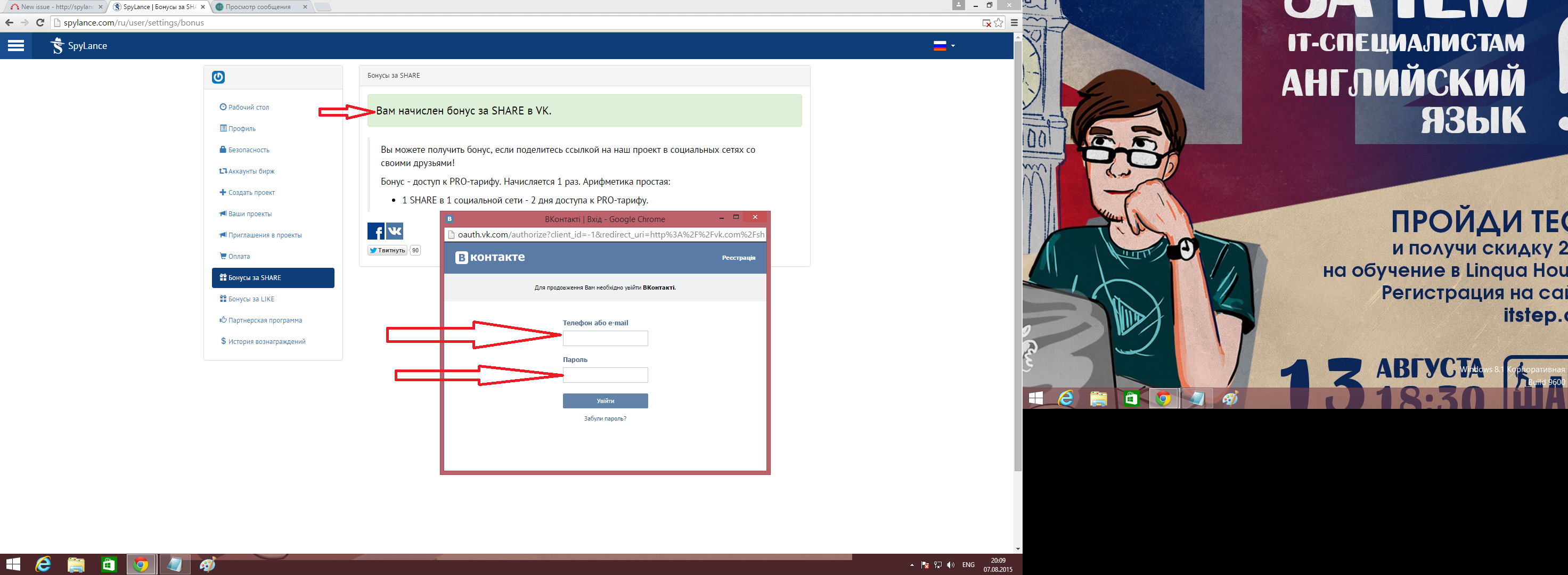Ожидаемый результат: Для зачисления бонуса нужно сделать share через аккаунт выбранной соц.сети