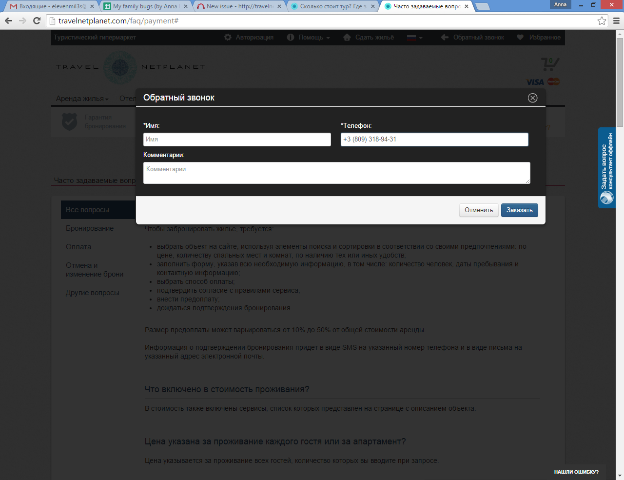 1. На главной странице http://travelnetplanet.com/ выбираем в верхнем меню пункт "обратный звонок".