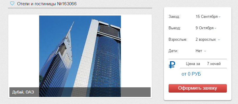 На некоторых страницах отелей цена проживания указана как "0 рублей".