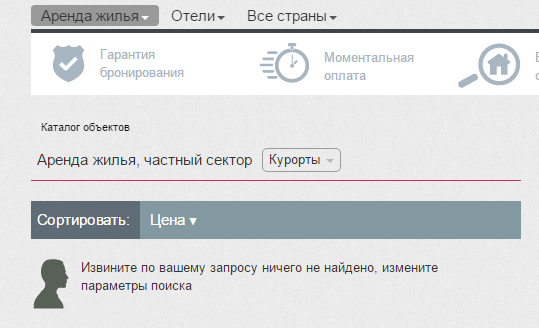 В списке, на который ссылается пункт "Все объекты" в выпадающем меню "Аренда жилья" попытка изменить направление сортировки приводит к сообщению "Извините по вашему запросу ничего не найдено, измените параметры поиска"