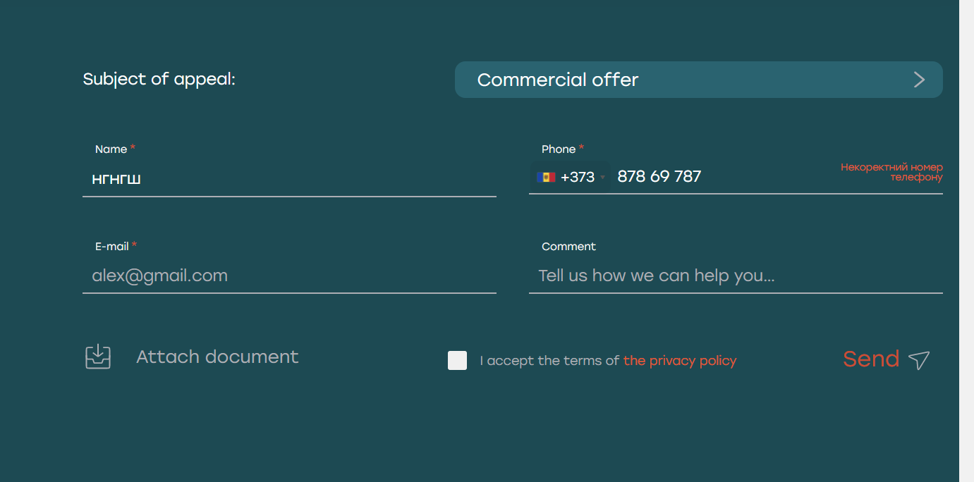 Фактический результат: При выборе англоязычной локализации сайта уведомление об ошибке при заполнении поля "Phone" формы "Subject of appeal" на русском языке
