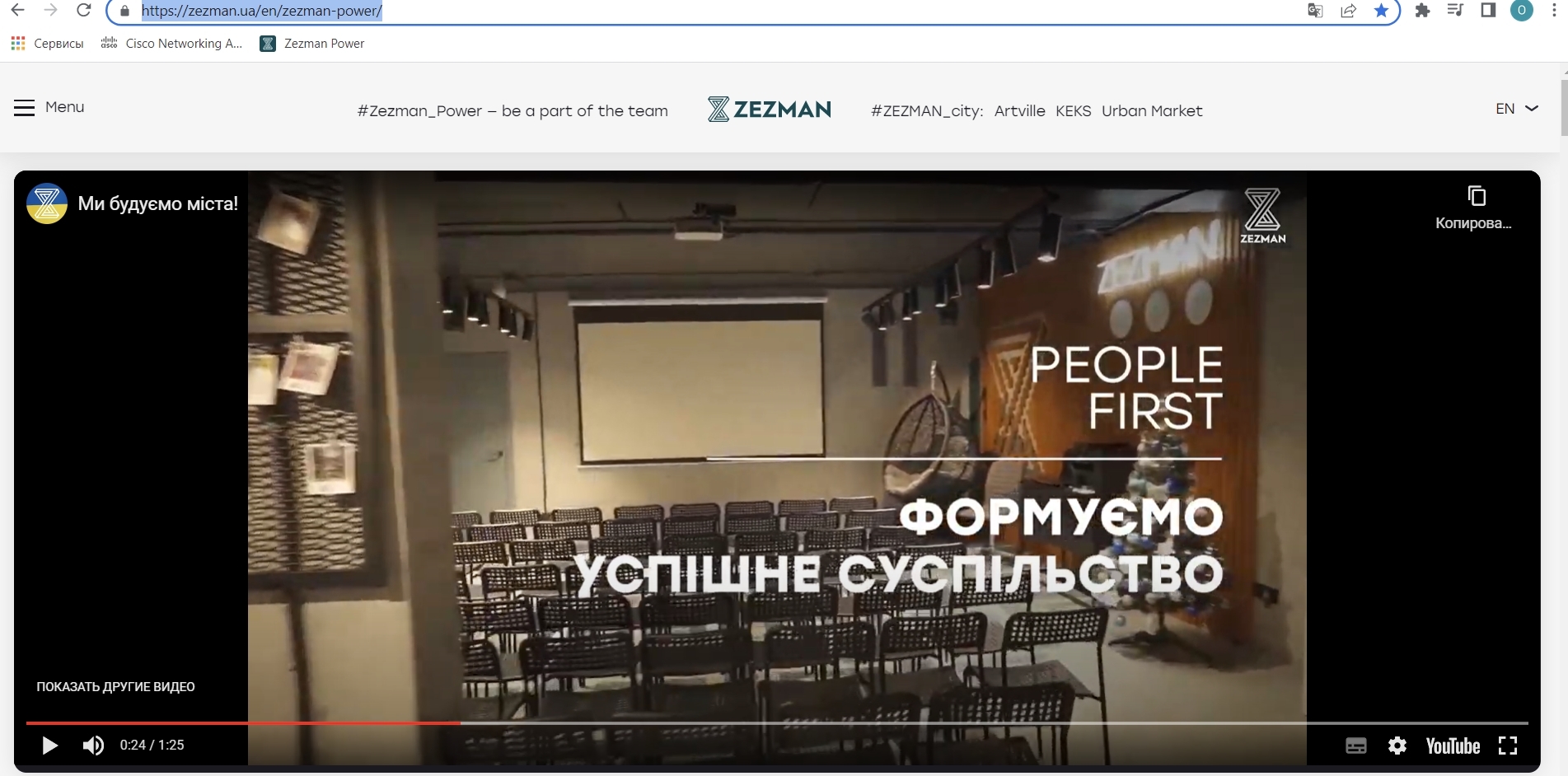 Фактический результат: При выборе англоязычной локализации сайта видео-презентация "Ми будуємо міста!" на украинском языке