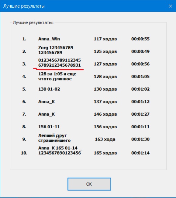 быстренько собрать пятнашки, в окно результатов ввести Ваше имя "01234567891123456789212345678931234567894"