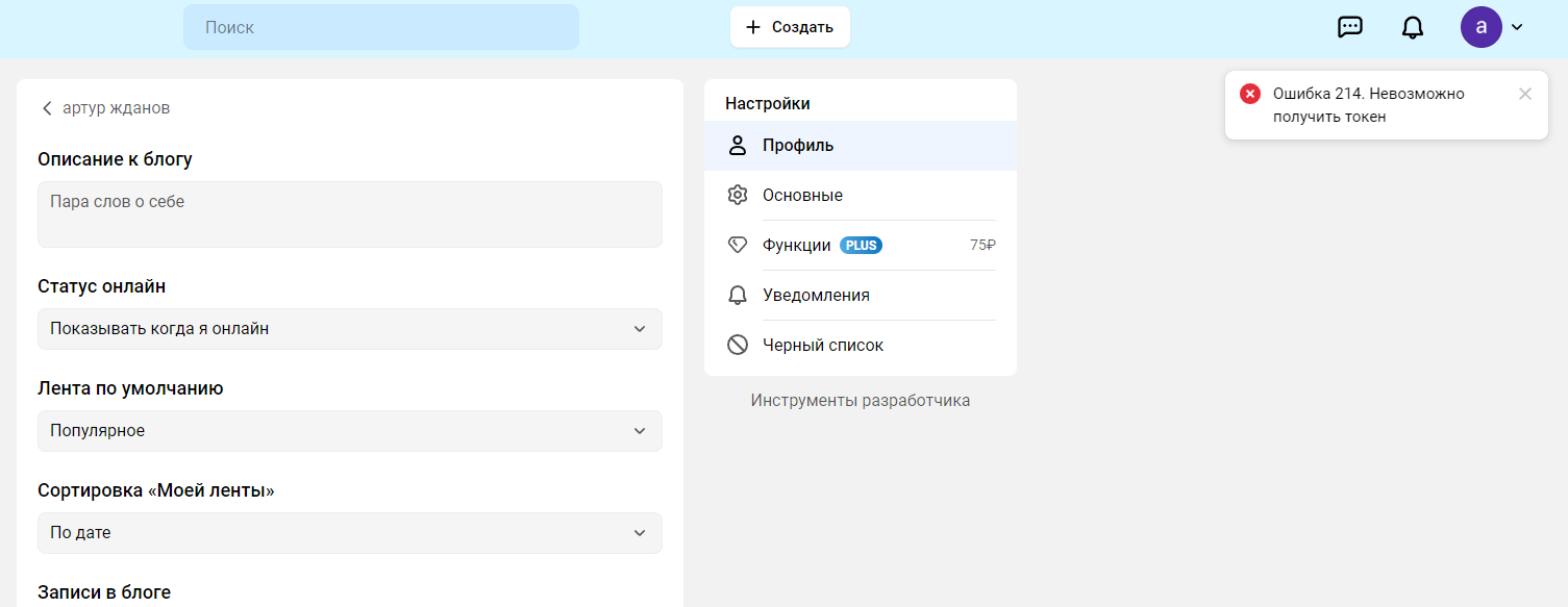 Ошибка 214 при нажатии "Инструменты разработчика" в настройках пользователя