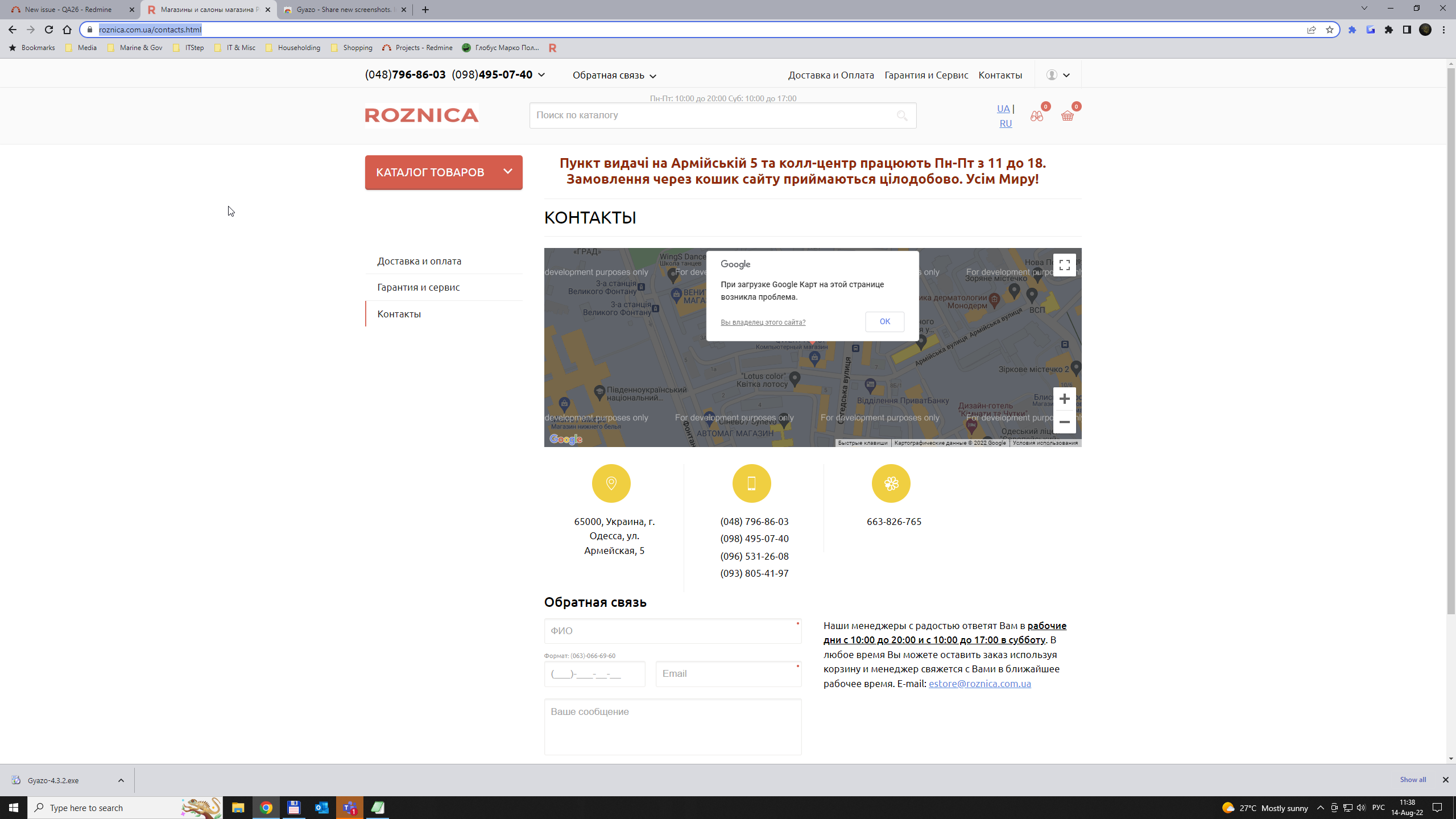 Фактический результат: Отсутствует функциональность "Google maps" на вкладке "контакты"
