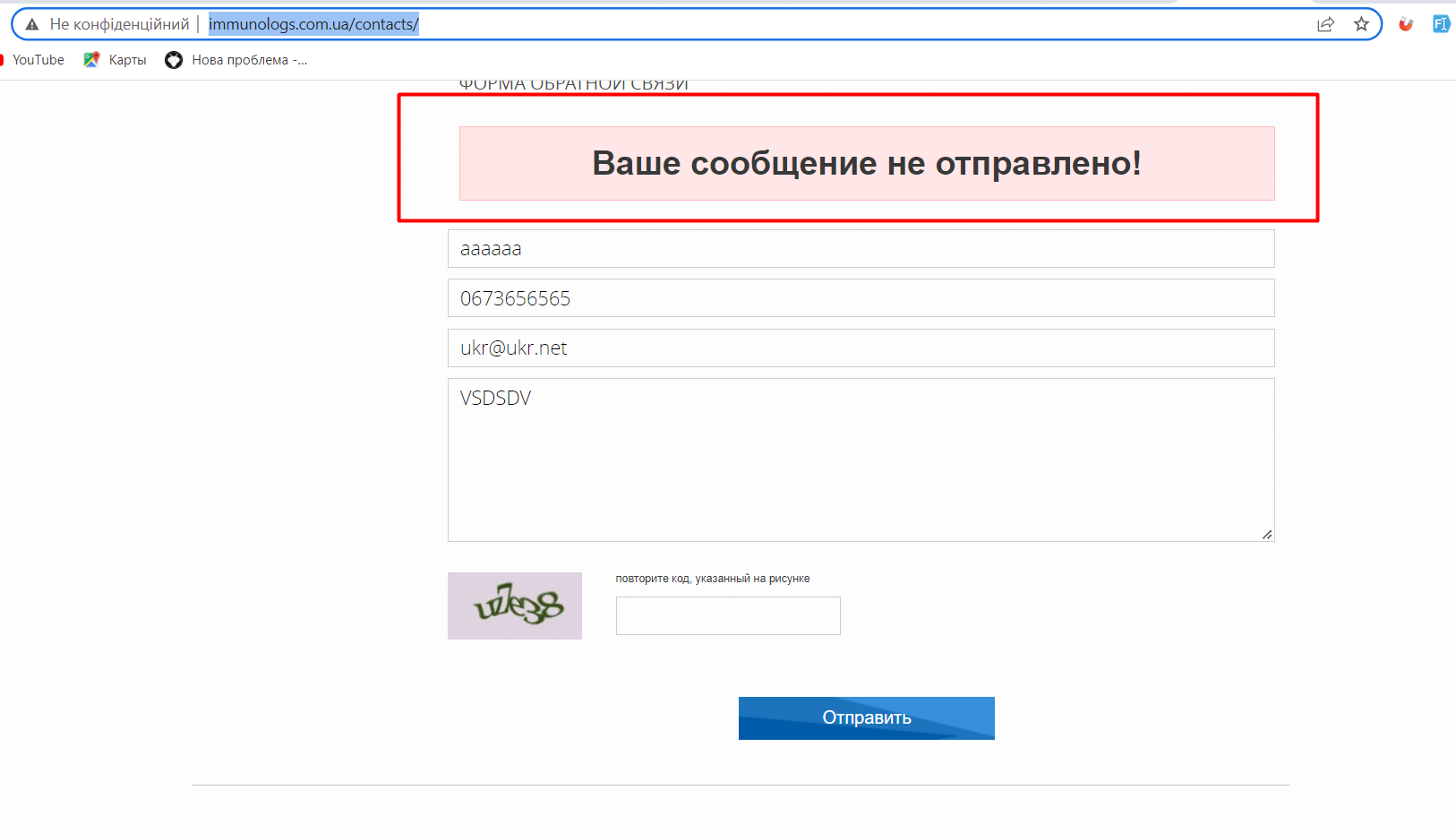 4. З'являється повідомлення "Ваше сообщение не отправлено!"