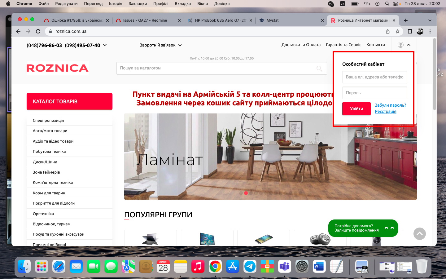 Кроки відтворення : відкрити меню авторизації на головній сторінці