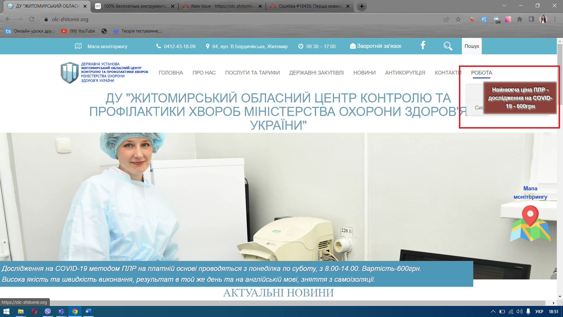 Оголошення на головній сторінці https://olc-zhitomir.org/ про знижену ціну на ПЛР тест перекриває меню "Робота"