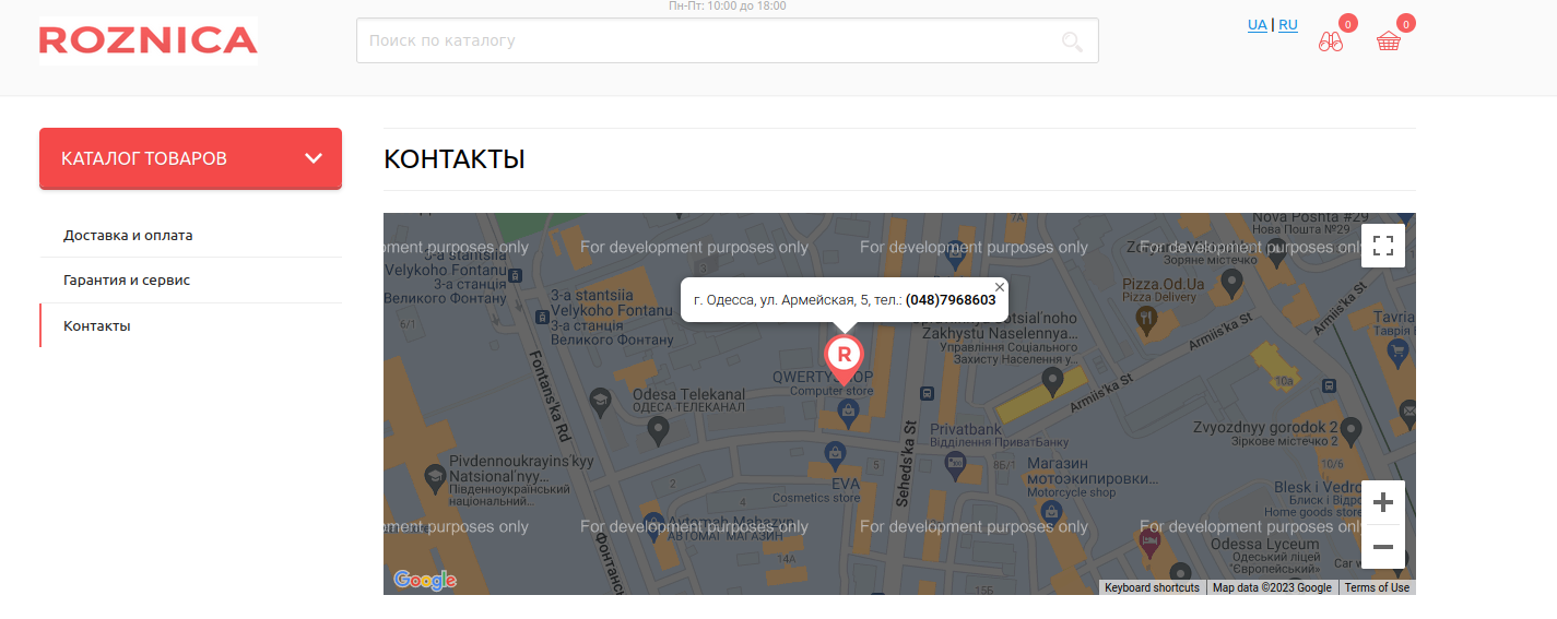 2) карта, на якій показано розташування магазину, покрита вотермарками "for development purposes only"