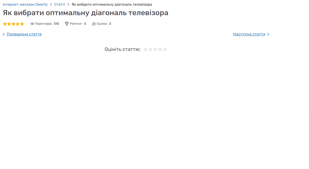 Фактический результат: Отсутствие информации по статье "Як вибрати оптимальну діагональ телевізора"