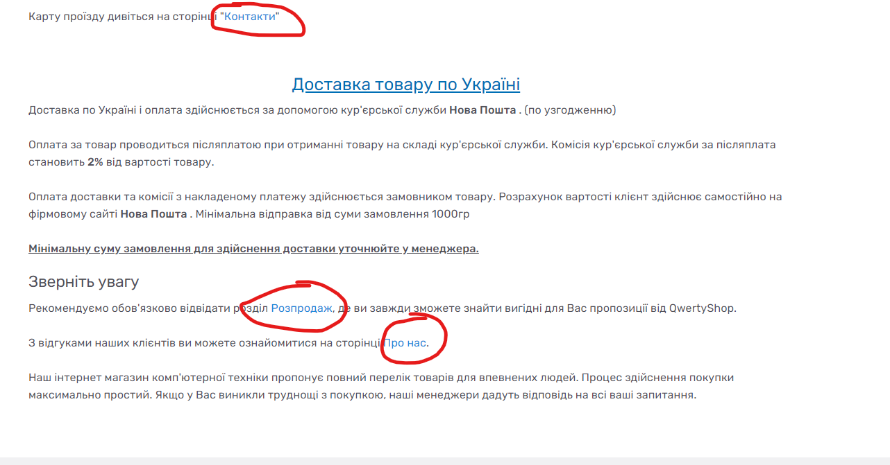 2 Исправить ошибки 404 в Разделе "Условия Доставки и Оплаты" при переходе по ссылкам "КОНТАКТИ" \ "РОЗПРОДАЖ" \ "ПРО НАС"