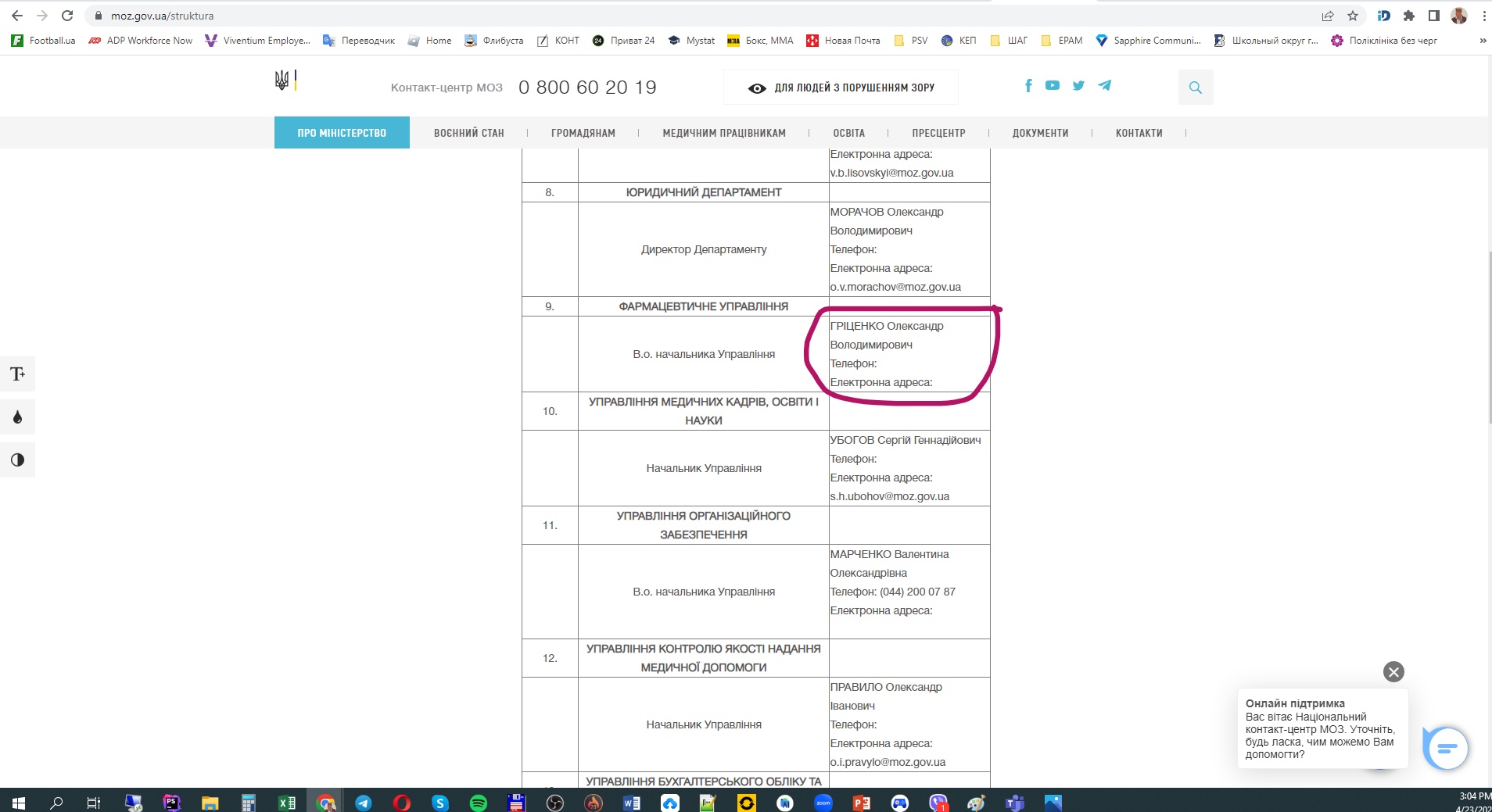 4. Scroll down to find a row “ФАРМАЦЕВТИЧНЕ УПРАВЛІННЯ” and information concerning "ГРІЦЕНКО Олександр" in the table.