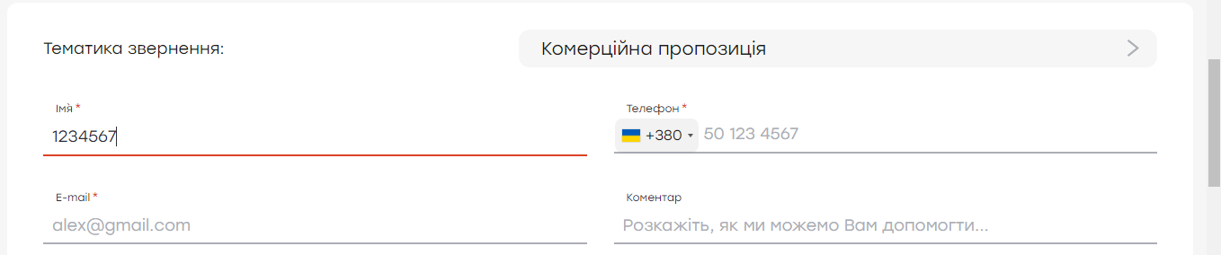 4. Прокручиваем вниз до середины сайта, в разделе "Тематика звернень" в поле для ввода имени вводим цифри.