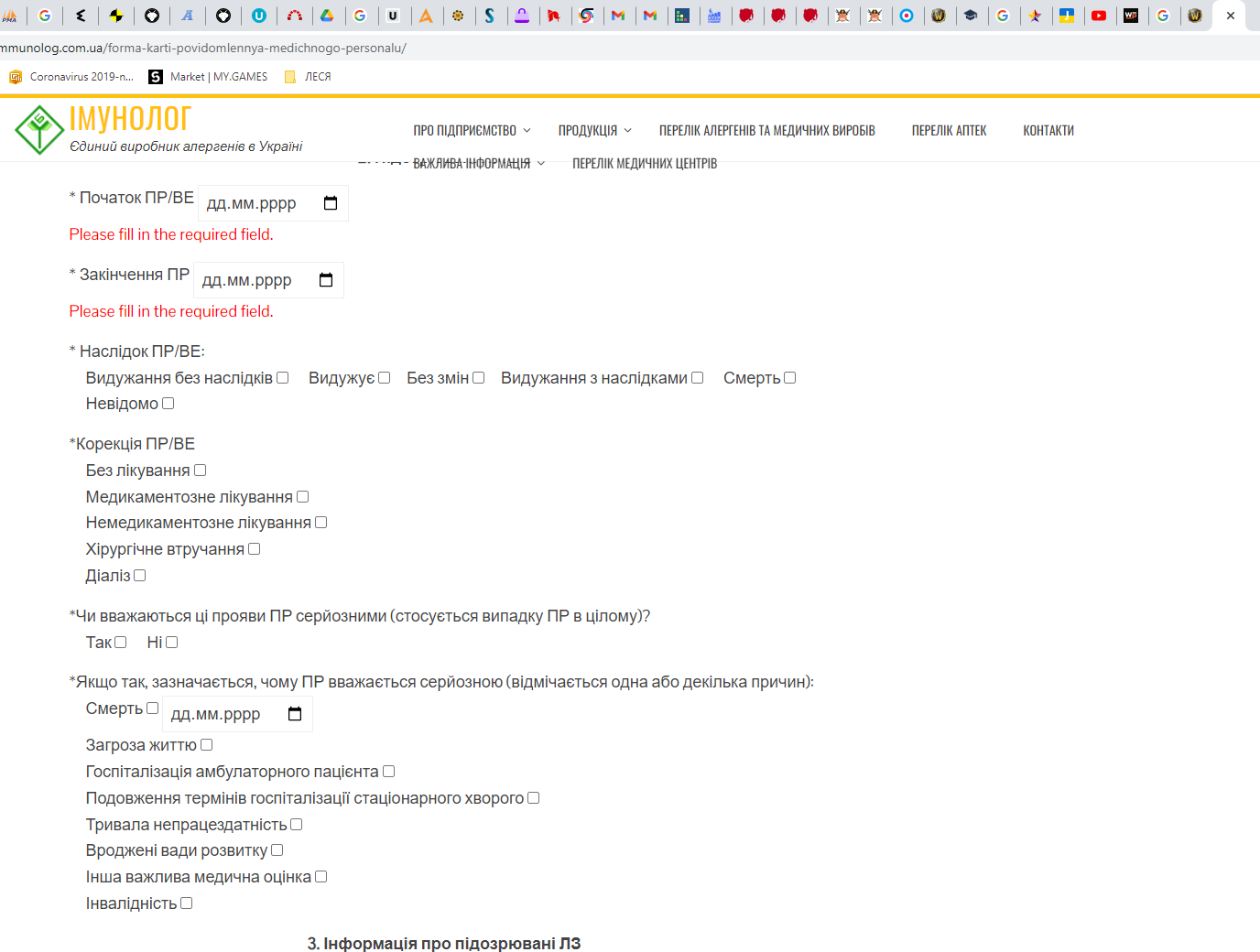 • Subject changed from Не відображає повідомлення Please fill in the required field.в формі карти-повідомлення медичного персоналу при відсиланні пустої форми в обовязкових полях to Не відображає повідомлення Please fill in the required field напроти усіх обовязкових полів в формі карти-повідомлення медичного персоналу при відсиланні порожніх даних