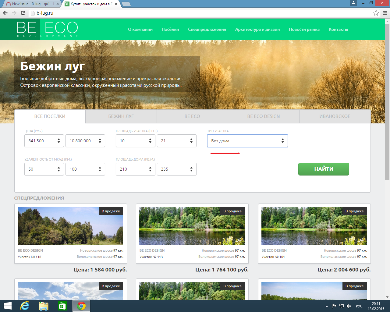 2. В поиске на главной странице в параметре поиска "Тип участка" выбираем "Без дома".