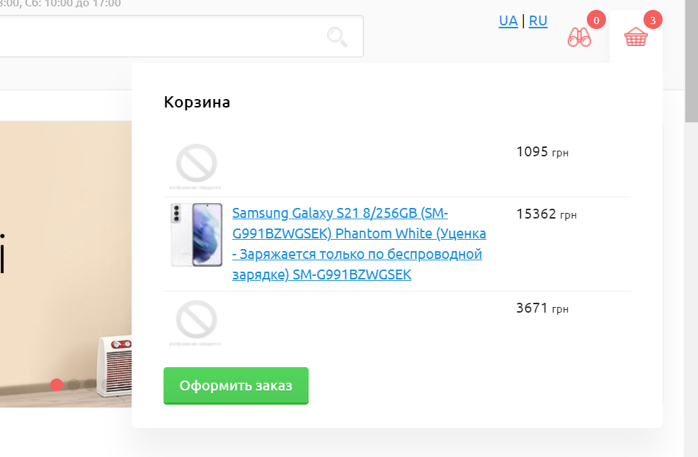 Фактический результат: В меню "Корзина" присутствует цена и название товара