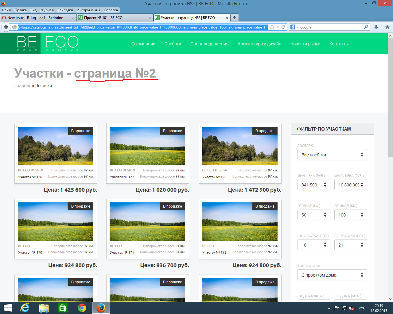 1). Переходим на http://b-lug.ru/catalog?field_settlement_tid=All&field_price_value=841500&field_price_value_1=10800000&field_area_place_value=10&field_area_place_value_1=21&field_mkad_value=50&field_mkad_value_1=100&field_special_value=All&&&field_place_value=&field_place_value_1=&&field_area_type_value=3&sort_by=created&sort_order=DESC&page=2