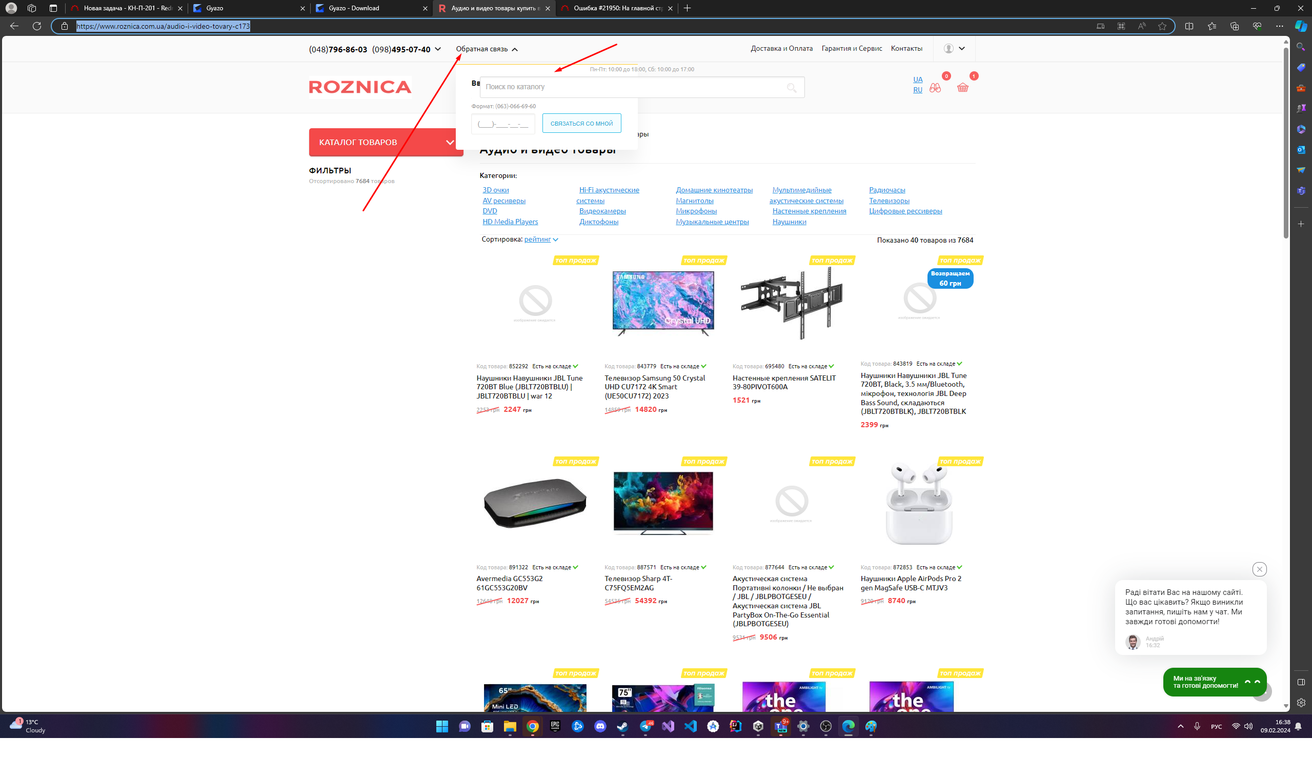 1) Открыть страницу с каталогом https://www.roznica.com.ua/audio-i-video-tovary-c173