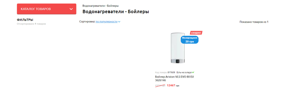 - Перейти на страницу категории товаров, где в списке отображается только один товар.