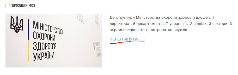 - Найти кнопку "Переглянути" под текстом в разделе подразделений МОЗ.
