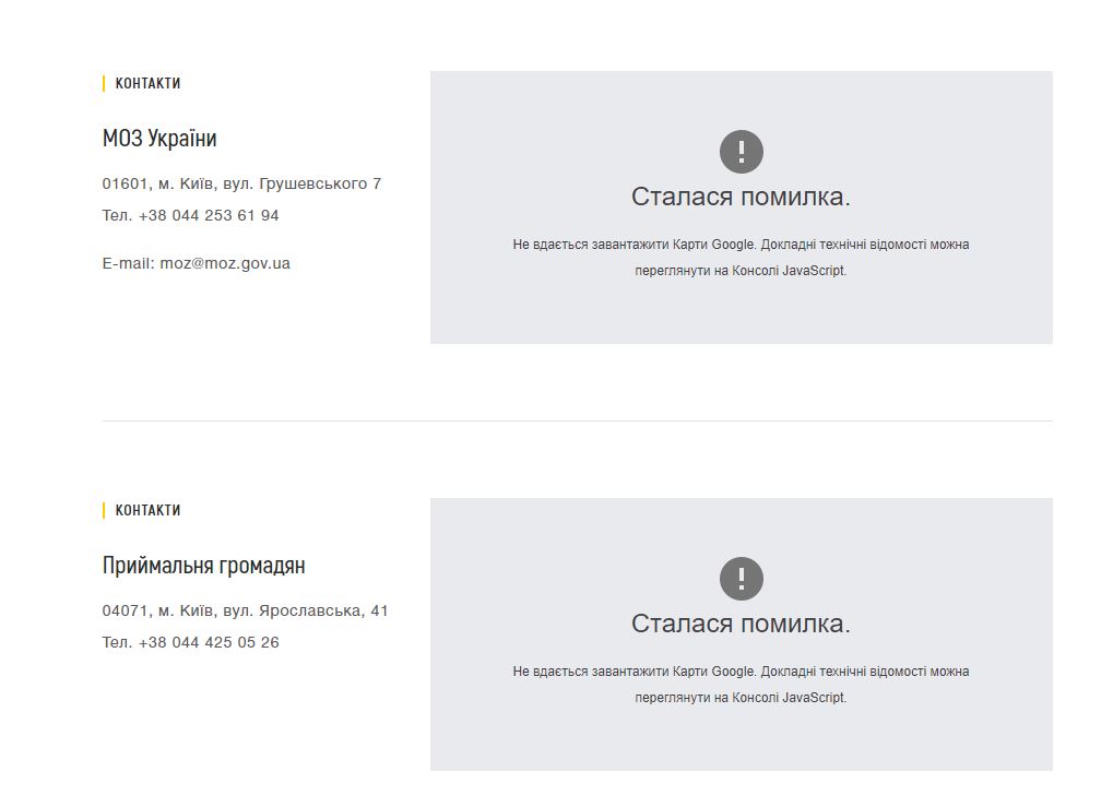 Гугл карты не работают на странице "Контакти" https://moz.gov.ua/kontakti