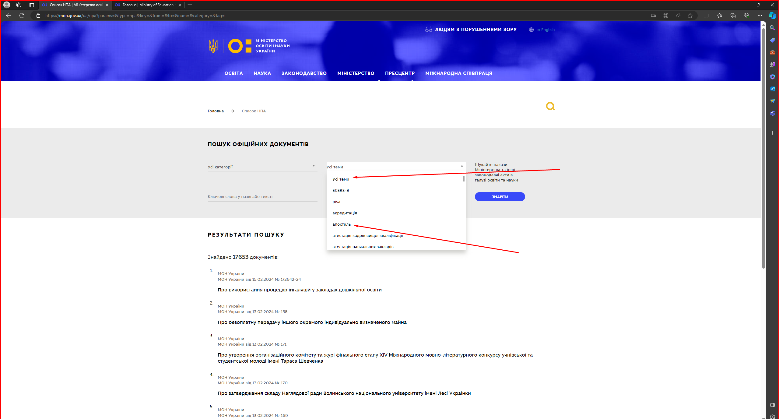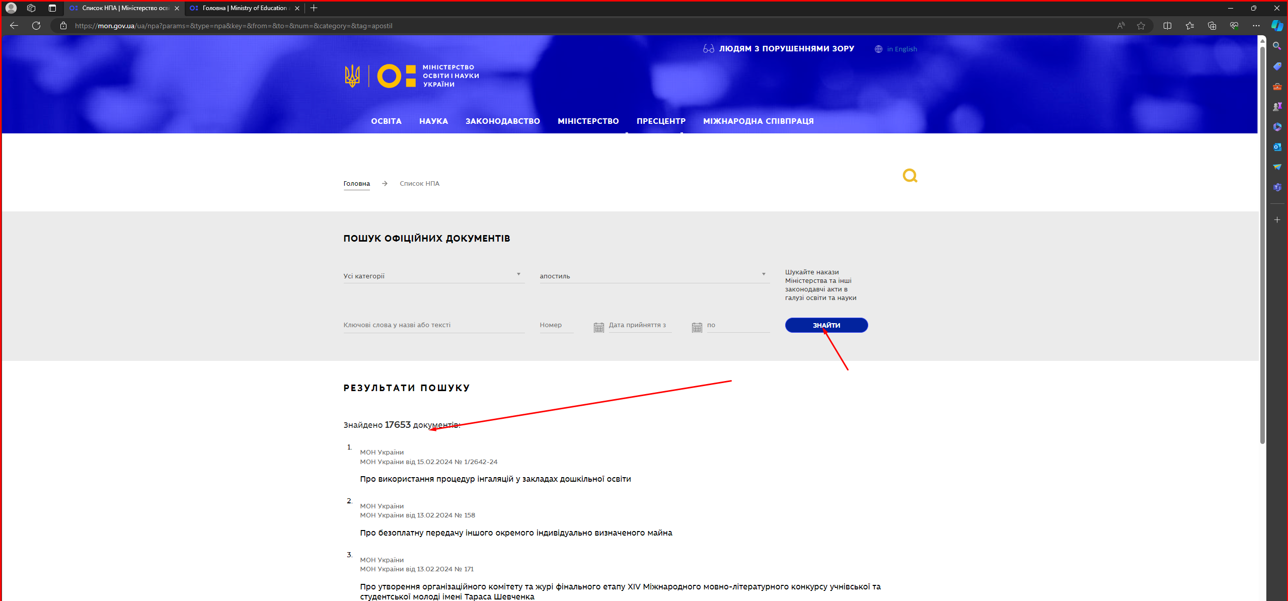1) Открыть страницу https://mon.gov.ua/ua/npa?params=&type=npa&key=&from=&to=&num=&category=&tag=