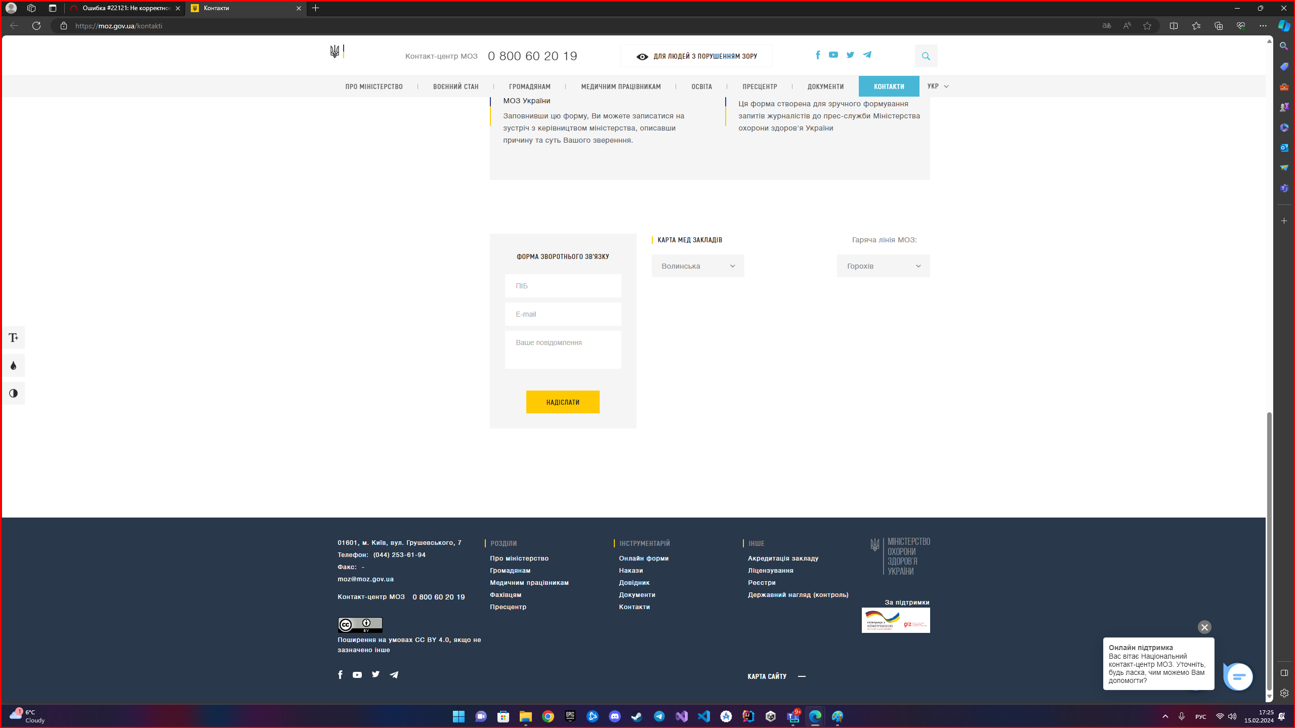 1) Открыть сайт https://moz.gov.ua/kontakti