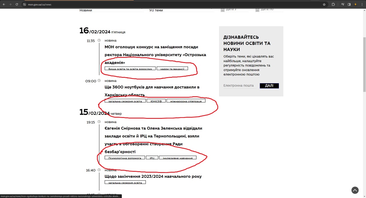 1) Открыть страницу "Пресцентр" "https://mon.gov.ua/ua/news".