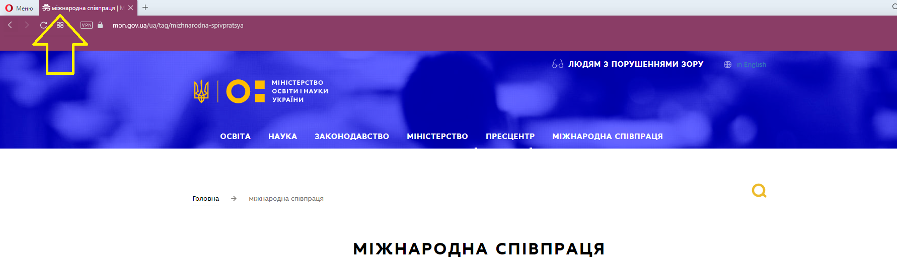 2. Перейти во вкладку "МІЖНАРОДНА СПІВПРАЦЯ" (https://mon.gov.ua/ua/tag/mizhnarodna-spivpratsya).