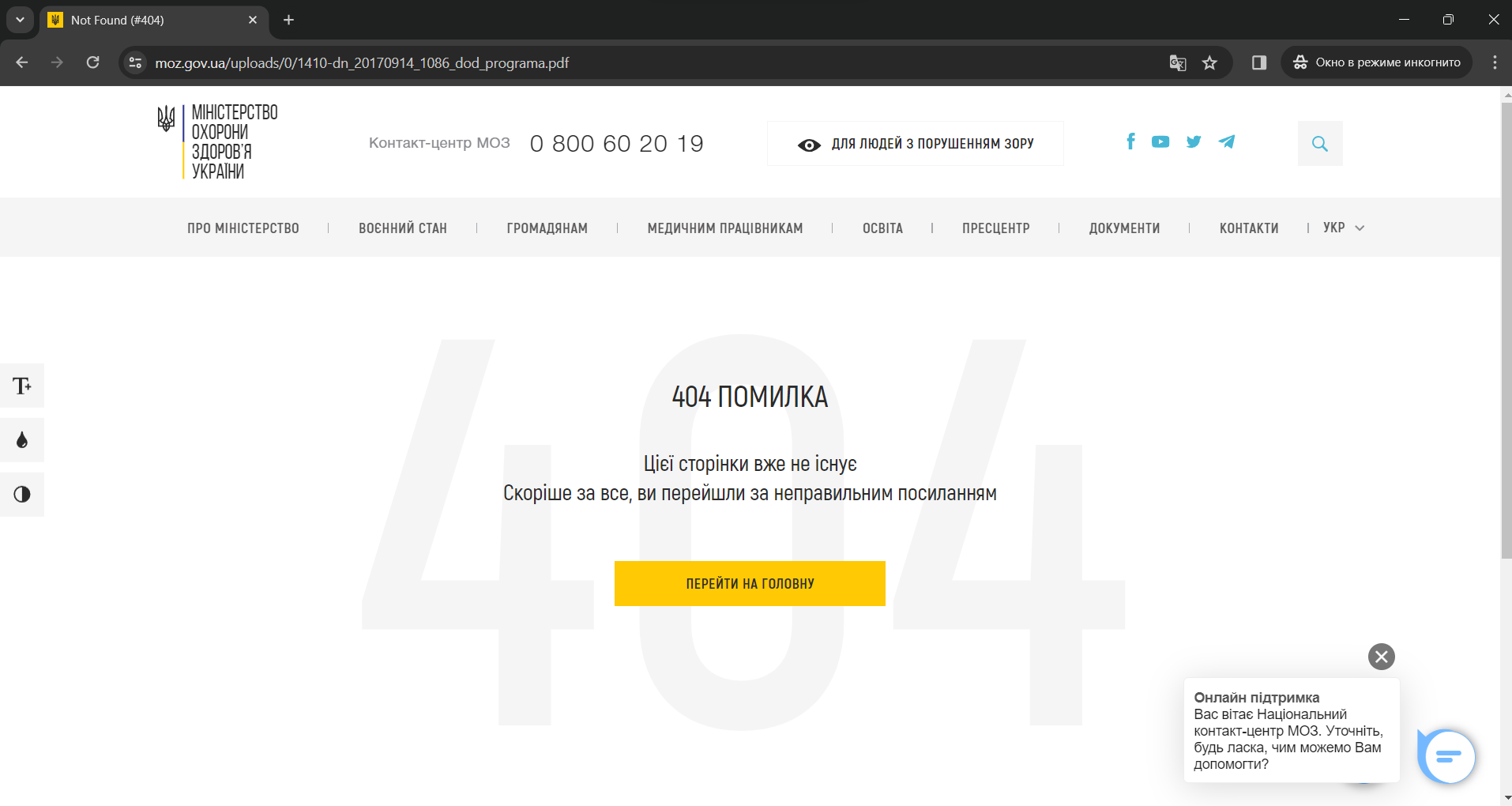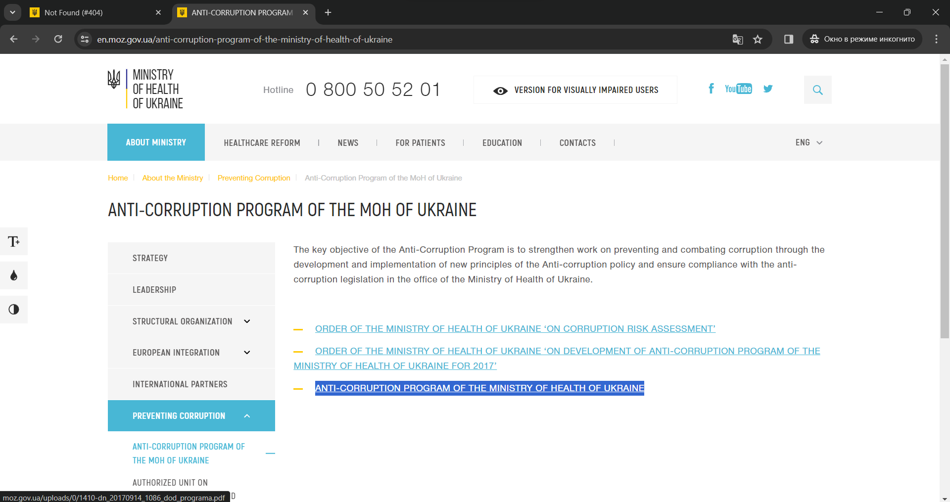 Ошибка 404 при открытии ссылки "ANTI-CORRUPTION PROGRAM OF THE MINISTRY OF HEALTH OF UKRAINE"
