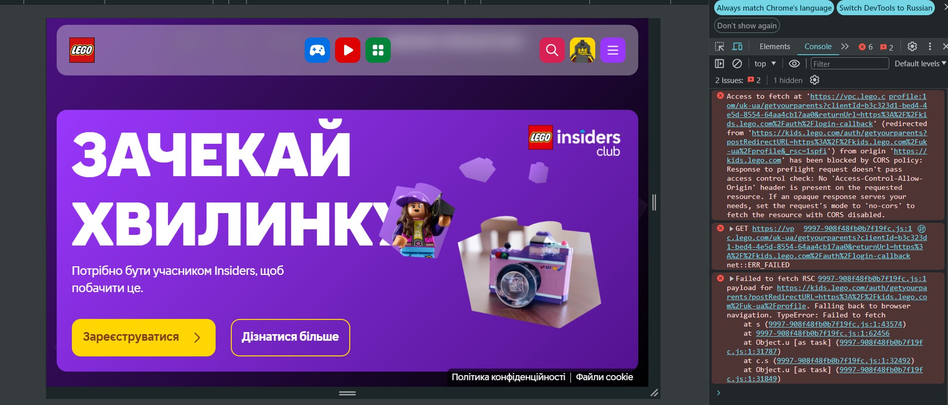 Фактический результат: выдает ошибки "GET https://vpc.lego.com/uk-ua/getyourparents?clientId=b3c323d1-