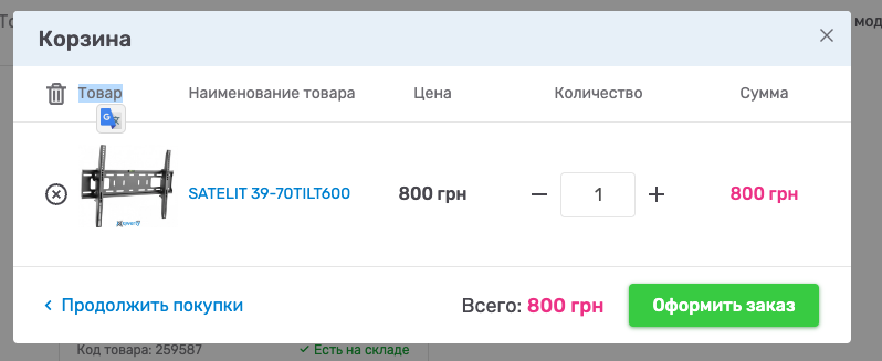 Ожидаемый результат: При нажатии на иконку "мусорного ведра" товар удаляется из корзины