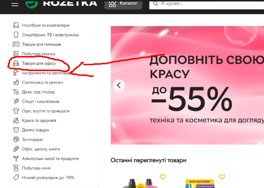Фактический результат: По левой стороне главной страницы, в списке категорий, возле иконки "кресла", надпись - товары для офиса.