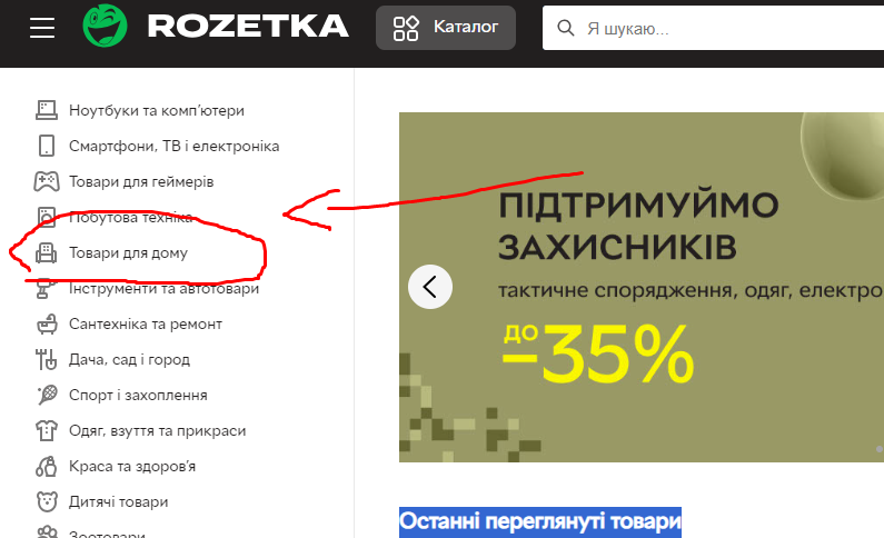 Ожидаемый результат: По левой стороне главной страницы, в списке категорий, возле иконки "кресла", надпись - товары для дома.