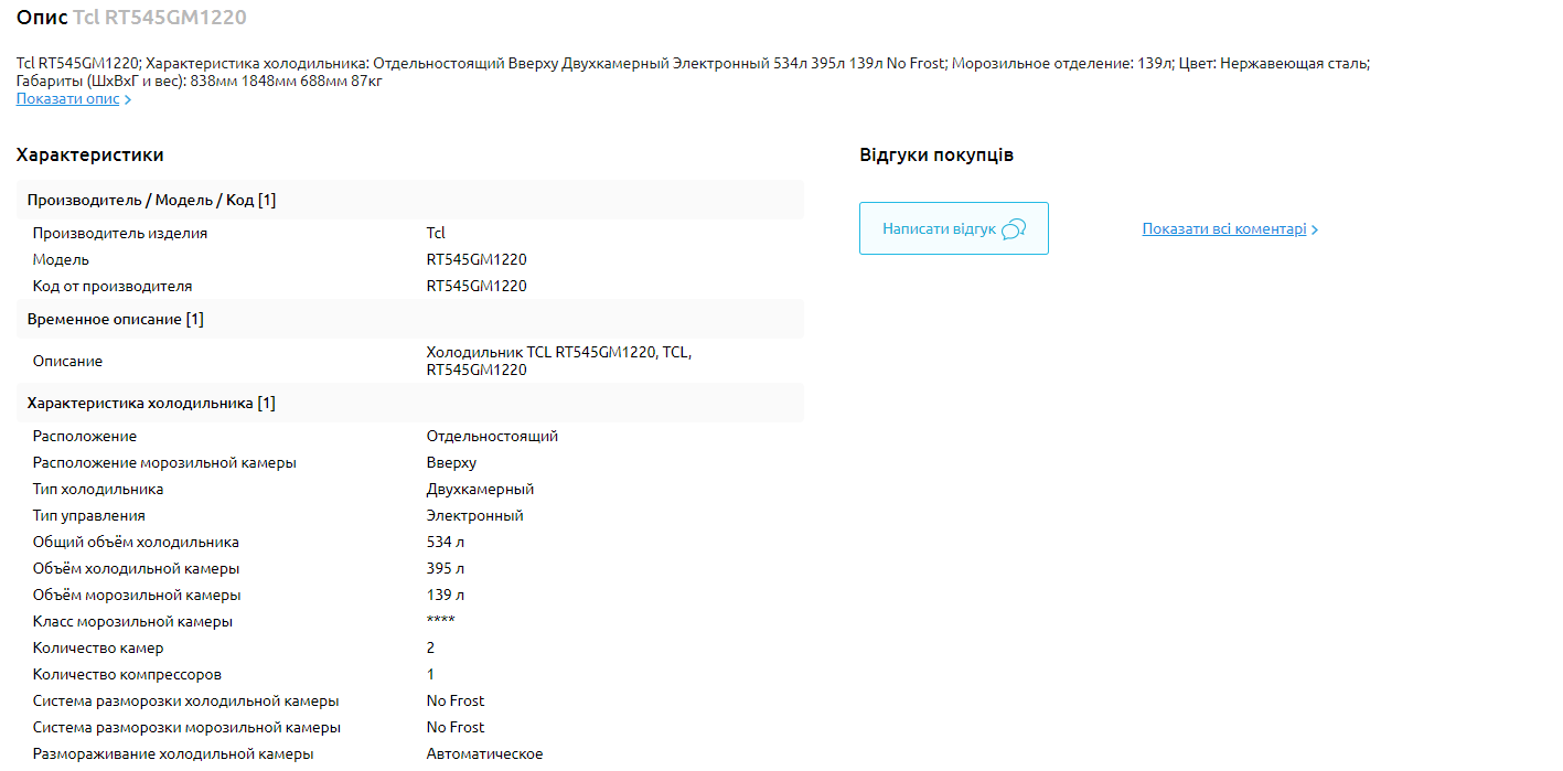 Фактический результат: Поле "Характеристики" полностью на русском языке в украинской локализации сайта