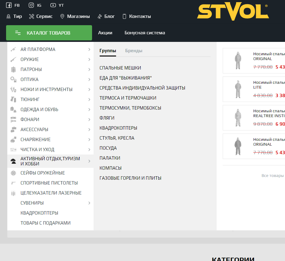 В списке категорий товаров находится перечень групп товаров :"СЕЙФЫ ОРУЖЕЙНЫЕ,СПОРТИВНЫЕ ПИСТОЛЕТЫ,ЦЕЛЕУКАЗАТЕЛИ ЛАЗЕРНЫЕ,КВАДРОКОПТЕРЫ,ТОВАРЫ С ПОДАРКАМИ".