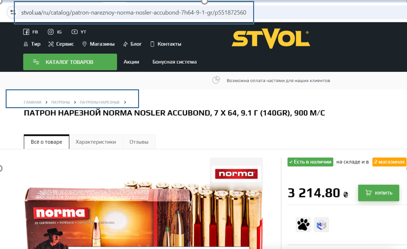3.Выбираем товар Патрон нарезной Norma Nosler Accubond, 7 х 64, 9.1 г (140GR), 900 м/с.