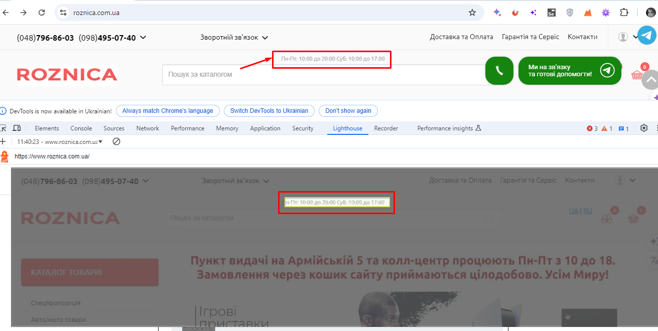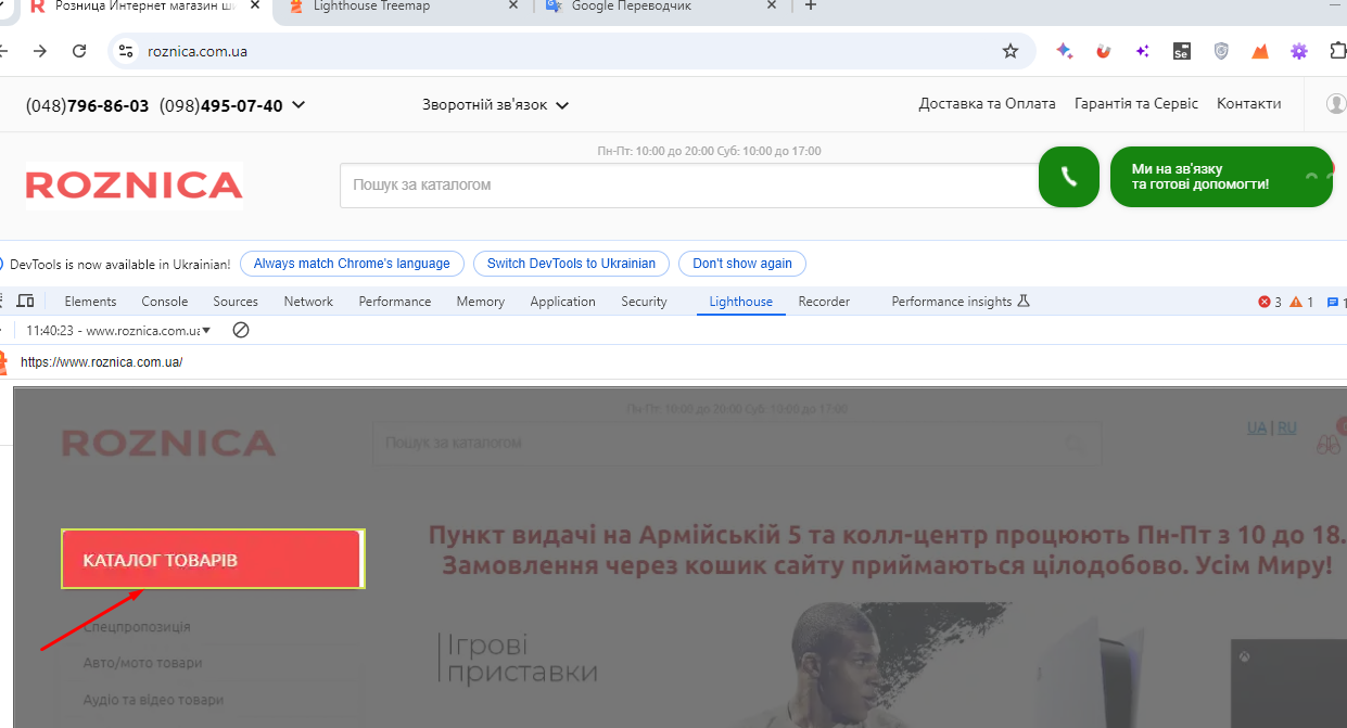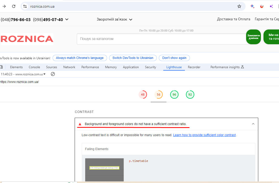 Низький контраст між кольорами фону та переднього плану на сторінці https://roznica.com.ua