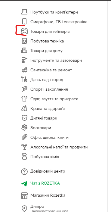 Функционал "Товары для геймеров" отсутствует в левом навигационном меню отсутствует