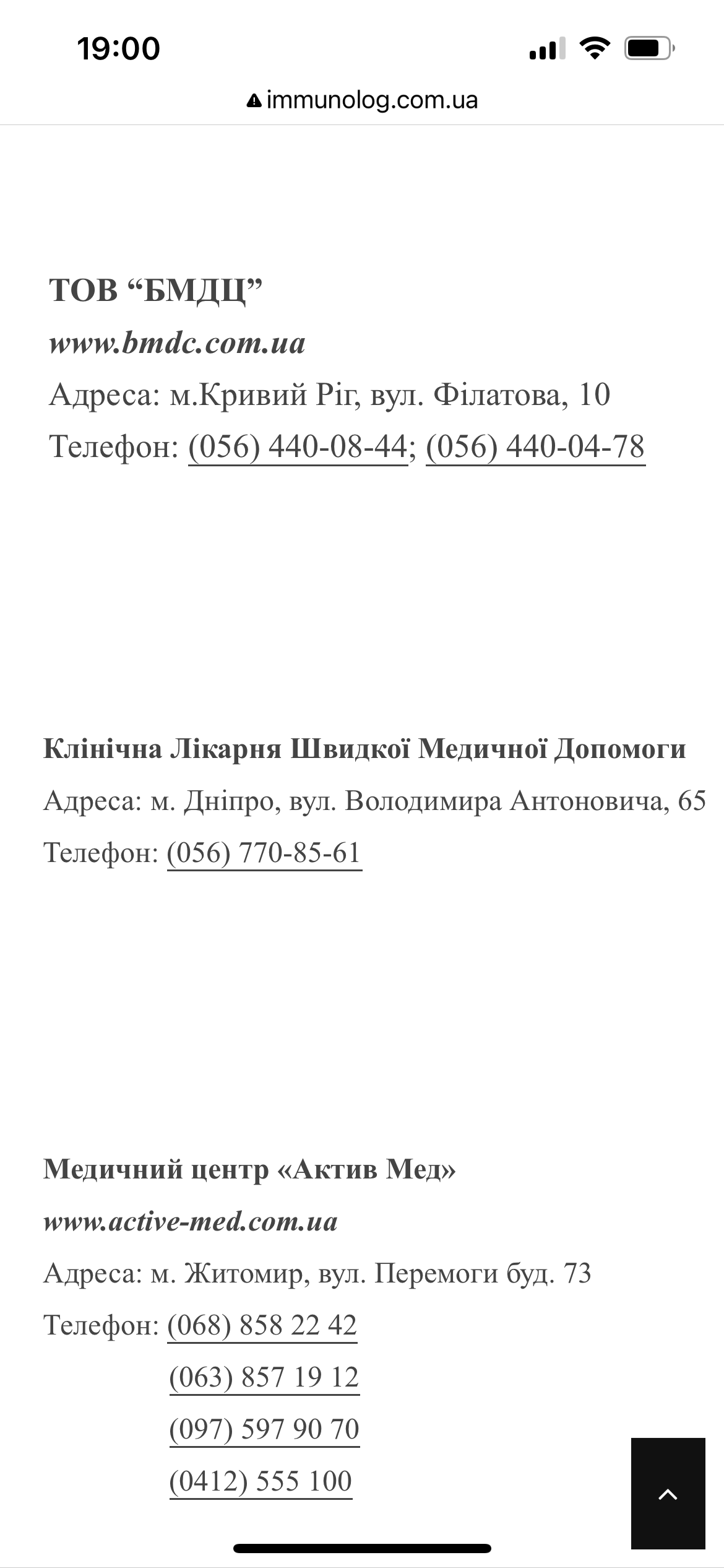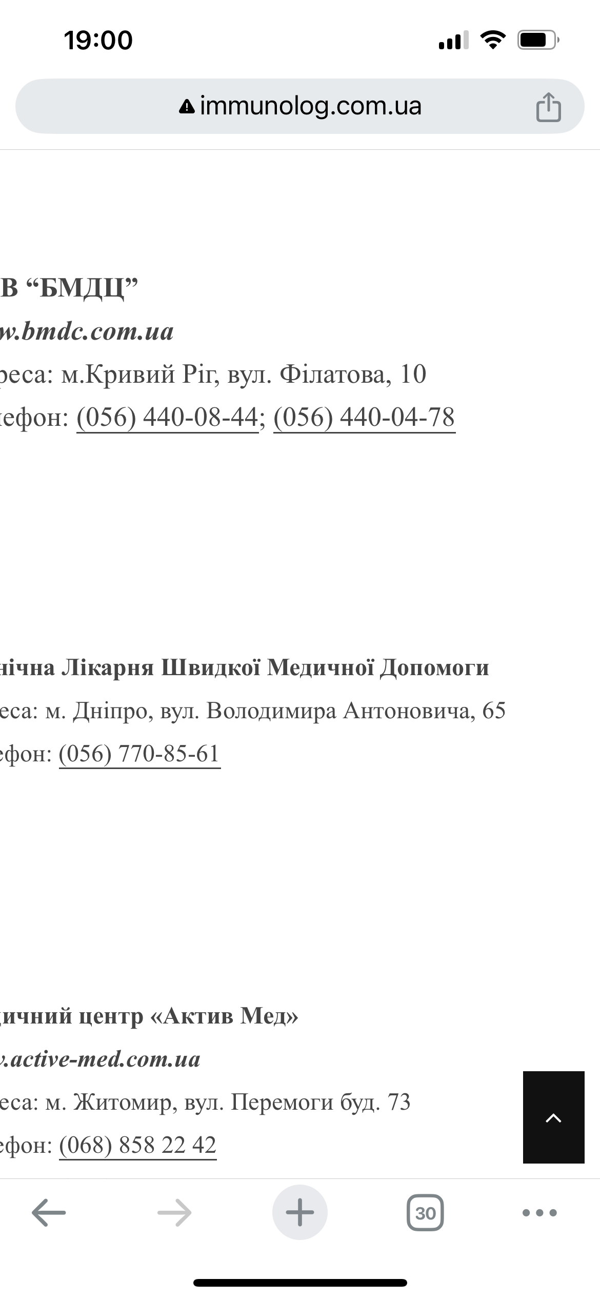 Зайти на сторінку http://immunolog.com.ua з IPfon 13, браузер Google вибрати в меню "Перелік медичних центрів", клікнути на нього , а потім пальцем провести зліва на право, щоб з'явилися адреси . Зображення адрес відображається частково ,треба коригувати для перегляду.