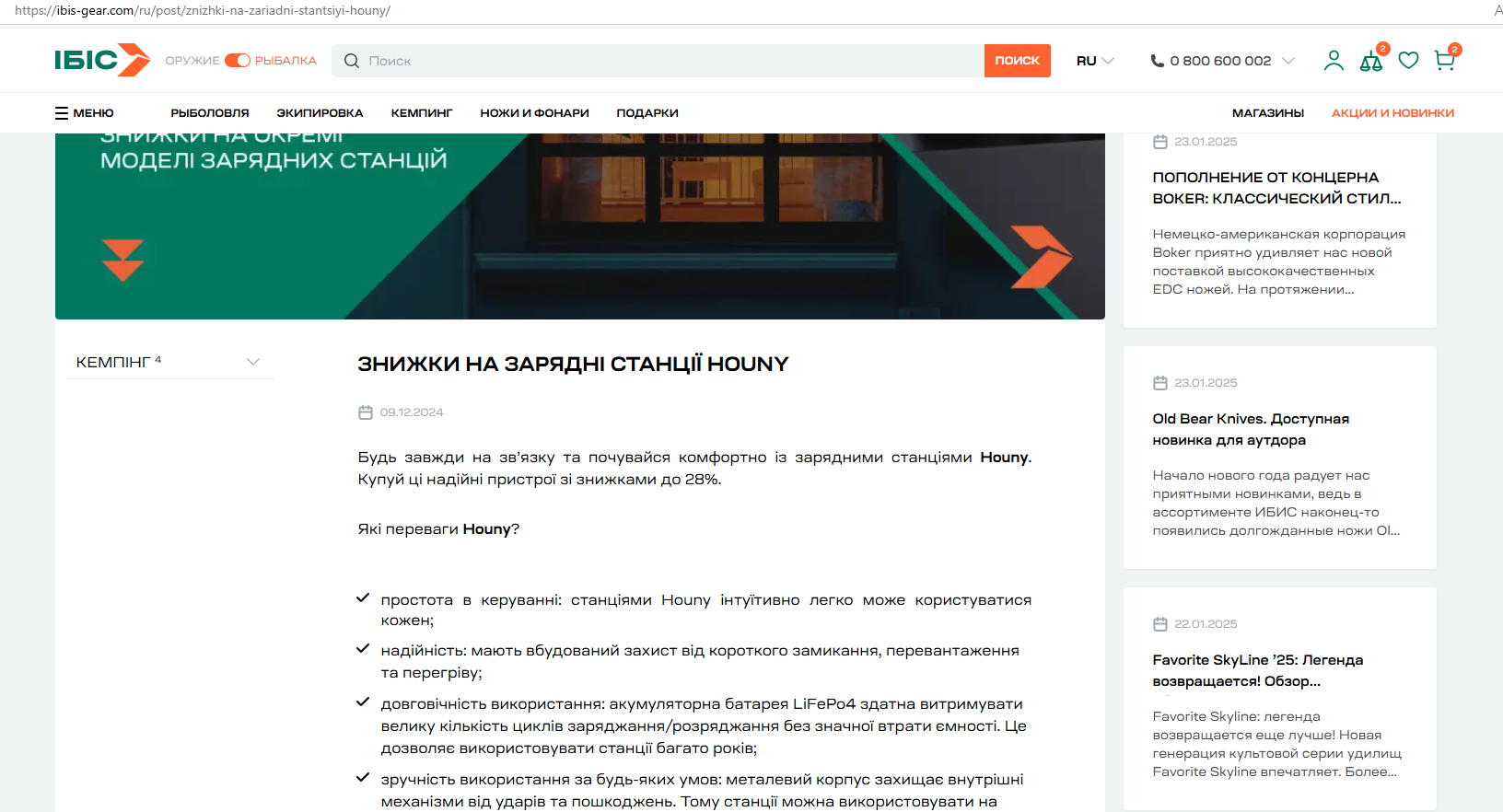 5) Перейти за посиланням на сторінку новин, новина "Знижки на зарядні станції Houny"