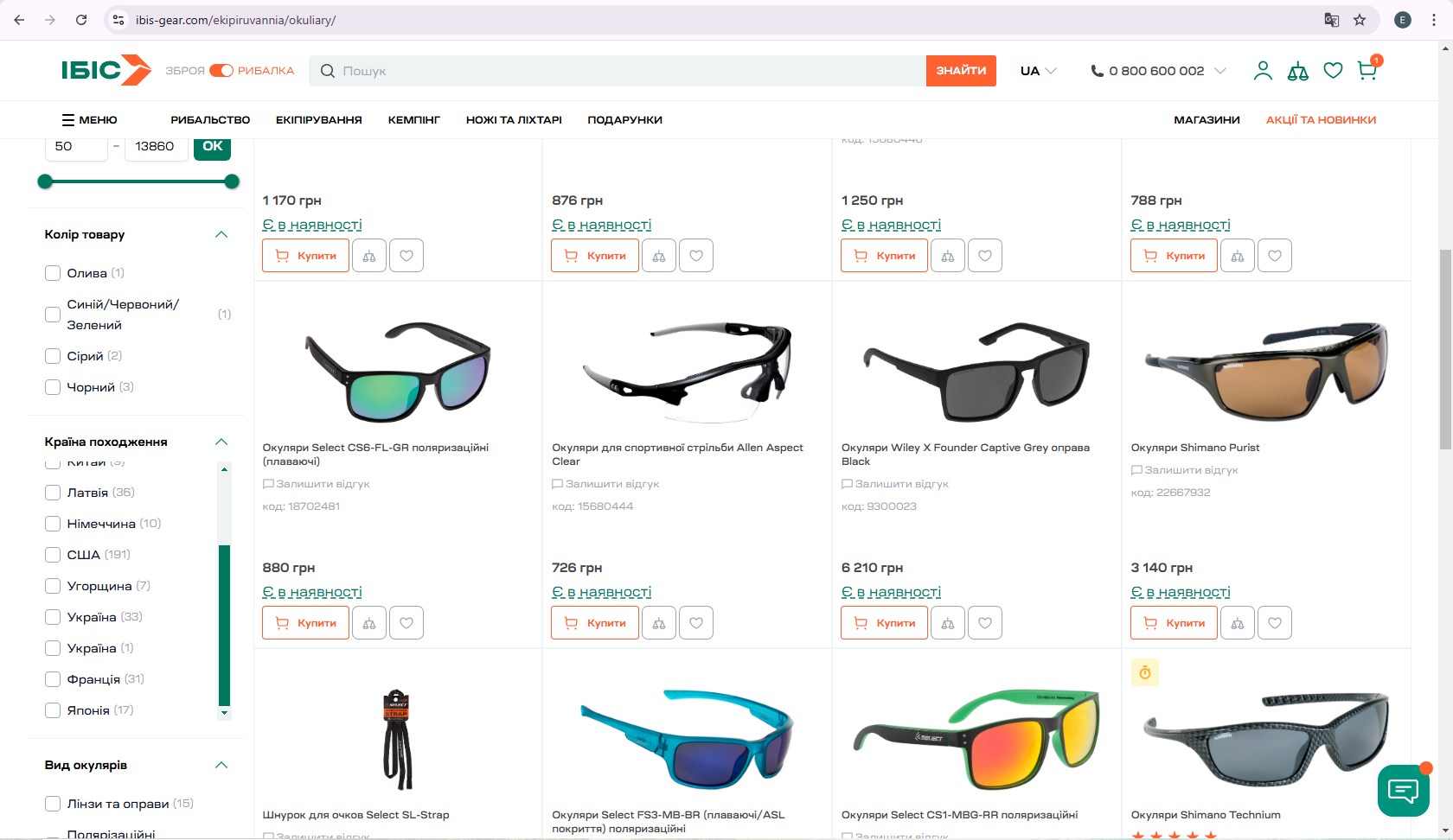 2 України (в фільтрі країни походження) в розділі "Екіпірування" в хедері сайту, підпункт "Окуляри та аксесуари для них"