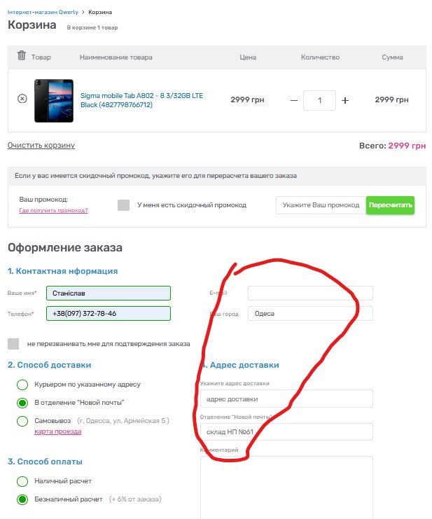 При оформлені заказа відсутній вибір адресів доставок крім м. Одеси