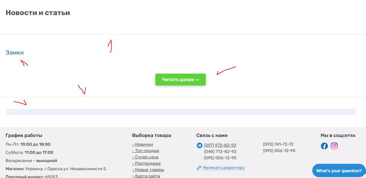 Фактичний результат : Над футером присутні зайві два дівайдера, синій заголовок "Замки" та кнопки "Читать далее" та синій блок під другим дівайдером