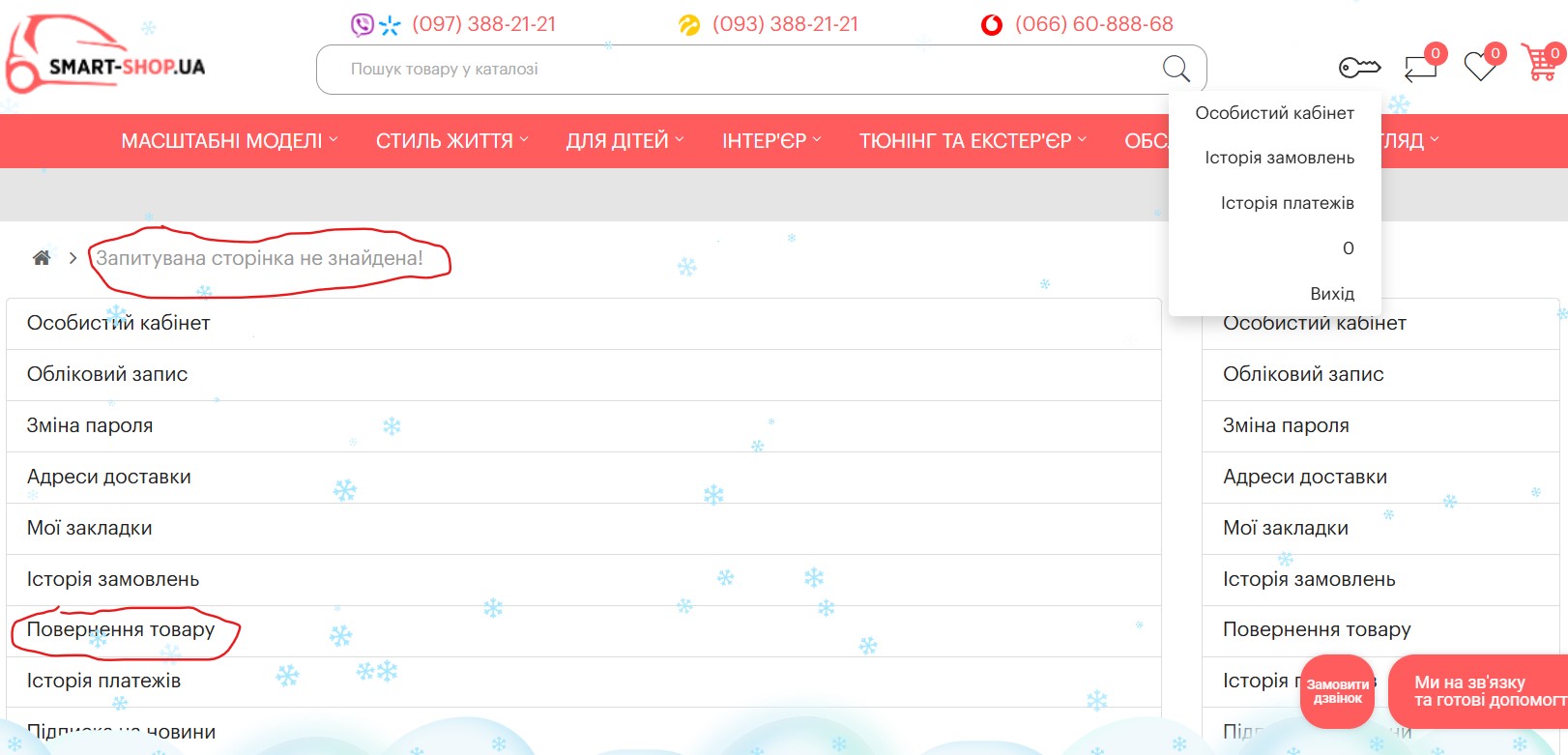 В меню «Особистий кабінет» при натисканні на пункт «Повернення товару» пише «Запитувана сторінка не знайдена!»