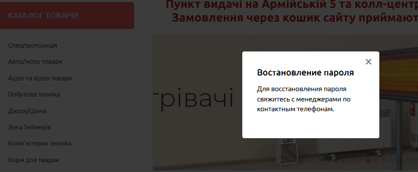 Модальне вікно "Забули пароль?" має російський переклад при обраній український мові